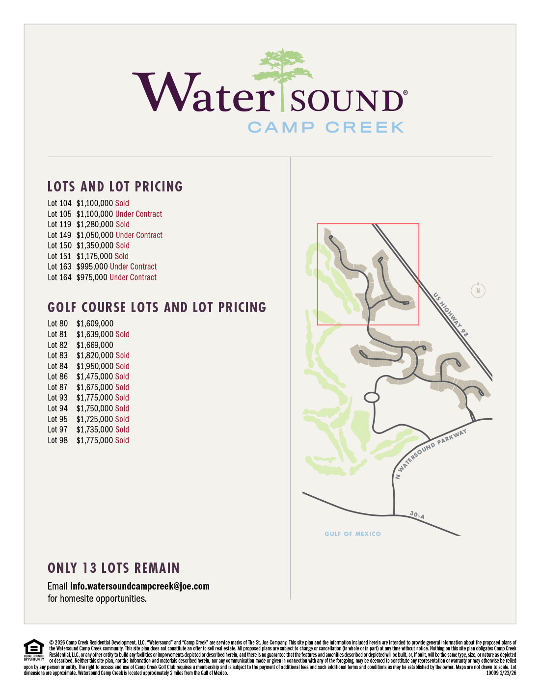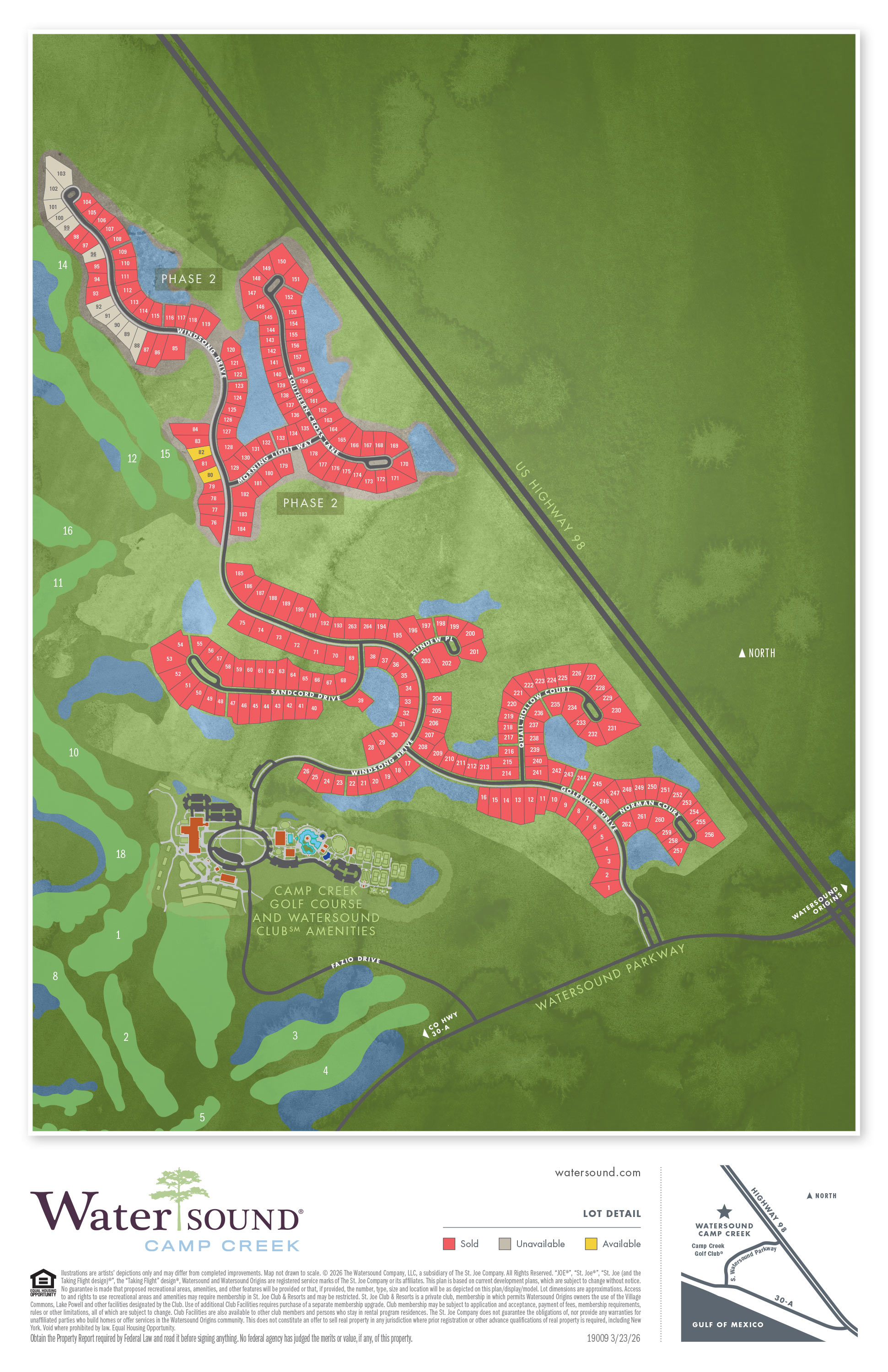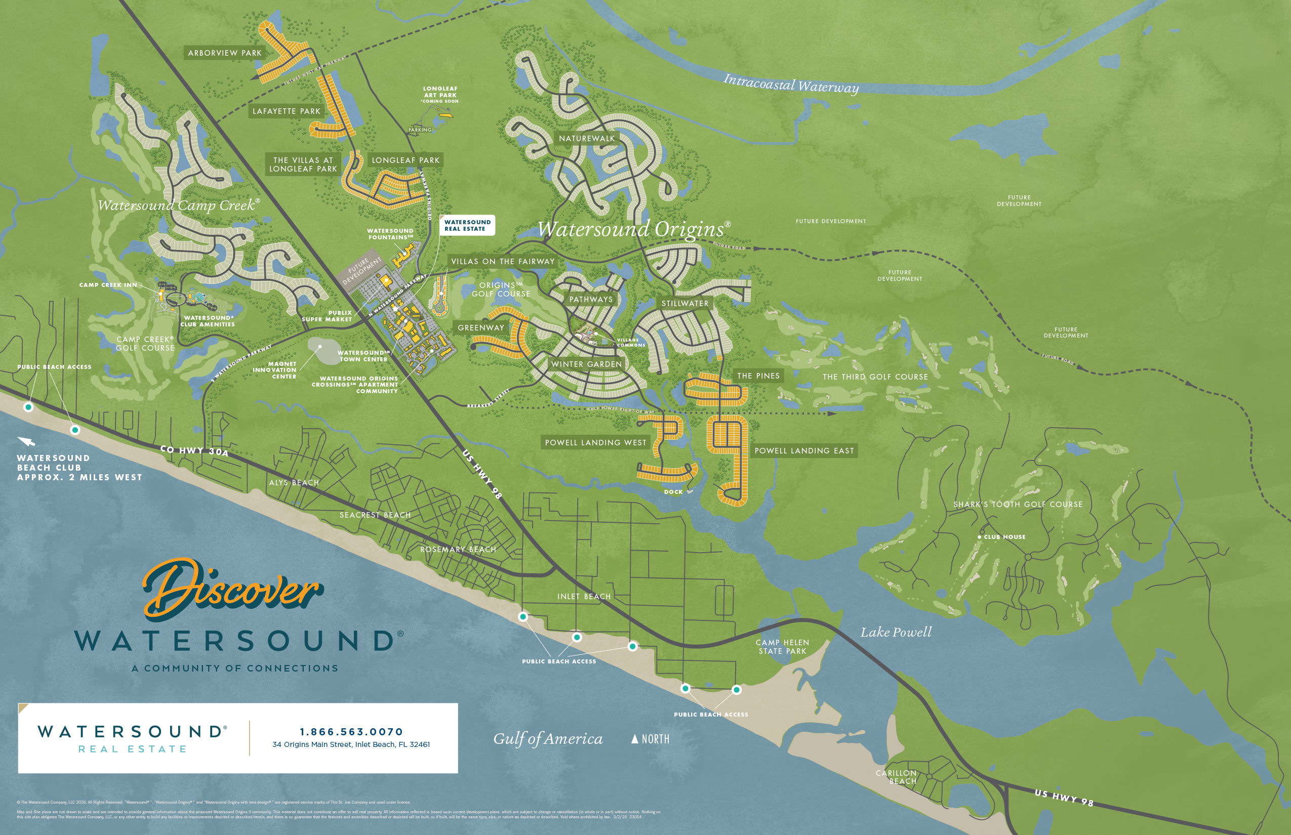 Thoughtfully planned behind a secure entry sits 263 homesites ranging from .25 to nearly an acre. Curated to provide for an array of style and size homes, every lot celebrates all that is the 30A lifestyle. Laid back. Neighborly. Accommodating. Exhilarating. We could go on and on, but we think you get the picture. Although it will be easy to get to both 30A and Hwy 98, this neighborhood is tucked away offering a calm respite from the daily routine commonly found in a resort location. Now’s the time to map out your future at the Watersound Camp Creek community.